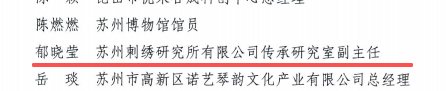 至目前为止,苏州刺绣研究所已拥有江苏省级乡土人才“三带”能手2名(郁晓莹、杨敏华),江苏省级乡土人才“三带”新秀9名(何显春、陶磊、王康霞、王菲、徐苏凤、周心怡、赵晶、王娟、陈旭瑶)。
