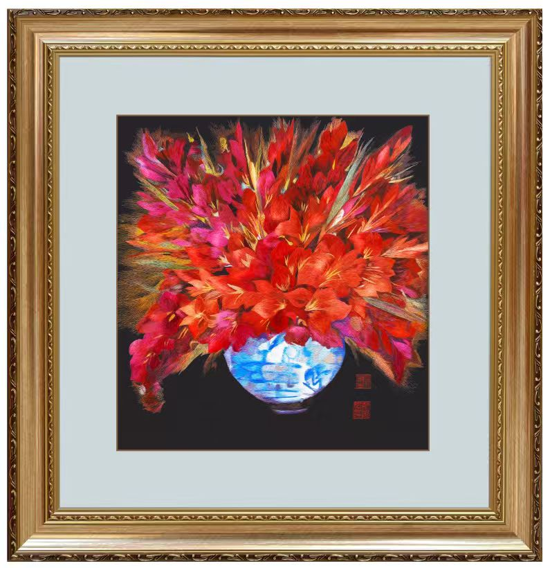 根据花的丝理以活泼的针法、精到的色彩,运用乱针绣技法表现了菖兰优美的花形、明丽的色调,绣出了原作者对美和生命力的追求
