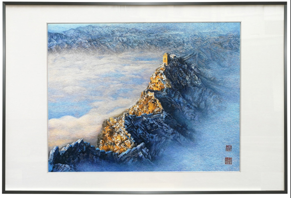 整体采用乱针绣手法,以扎实的针法铺陈展现长城遗迹壮阔之美。