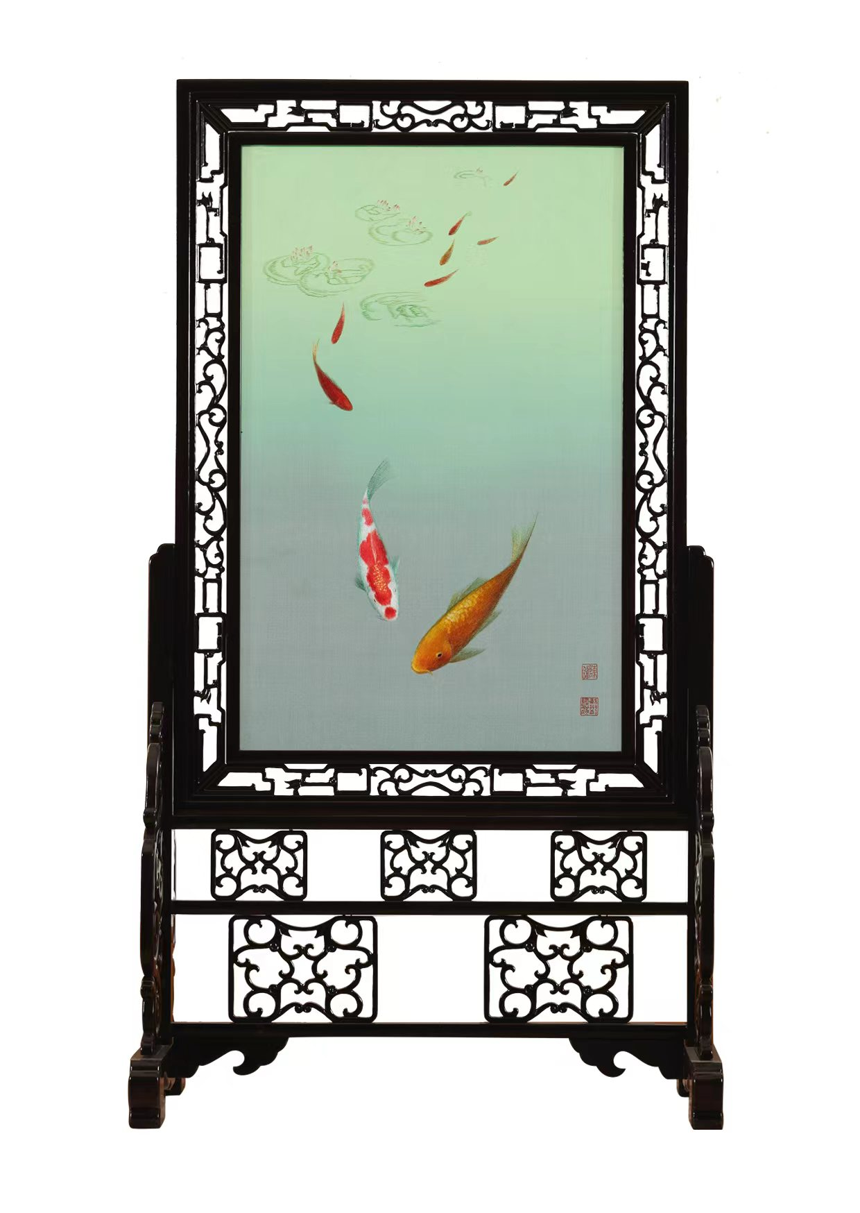 运用苏绣传统细绣的针法,将锦鲤鱼姿态演绎得栩栩如生;荷叶、荷花采用虚实针绣制,显得若隐若现,呈现一种朦胧之美。